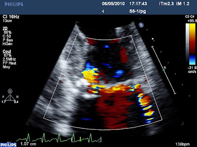 70 ans, OAP, Gros souffle d’IM, mais une ETT peu informative. On devine un jet très excentré, avec une PISA, naissant d’une zone commissurale postérieure très calcifiée avec un cône d’ombre postérieur (la partie postérieure de l’anneau est massivement calcifiée). En ETO 3d, on confirme la présence d’un prolapsus de la commissure postérieure (a droite de l’image), qui est figée dans la calcification. La fonction i-sclice permet de découper le volume 3d acquis selon de coupes parallèles dont ont peu régler l’épaisseur et l’orientation sur les trois plans de l’espace. Quand on s’oriente parallèle à l’anneau mitral, on retrouve bien le prolapsus commissural (en haut sur l’image) avant le plan de l’anneau, figée dan l’OG. On aurait peut-être compris le mécanisme de cette fuite sans le 3d, mais ces fonctions permettent de passer du gros doute à une affirmation. Inutile d’insister sur l’outil de communication, les « non initiés » comprennent enfin de quoi on parle!
