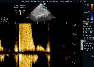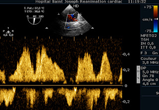 Mais chacun sait qu’on écoute, aux portes (ouah, la blague du siècle! heureusement que vous êtes tous en vacances…), et Madame à un souffle à l’auscultation. Un PDS. (Putain De Souffle). Alors, on redécouvre l’insuffisance mitrale sur prolapsus complexe, avec un jet par prolapsus commissural antérieur, et un prolapsus du feuillet antérieur. En ETO, le reflux systolique est franc dans la veine pulmonaire inférieure droite.