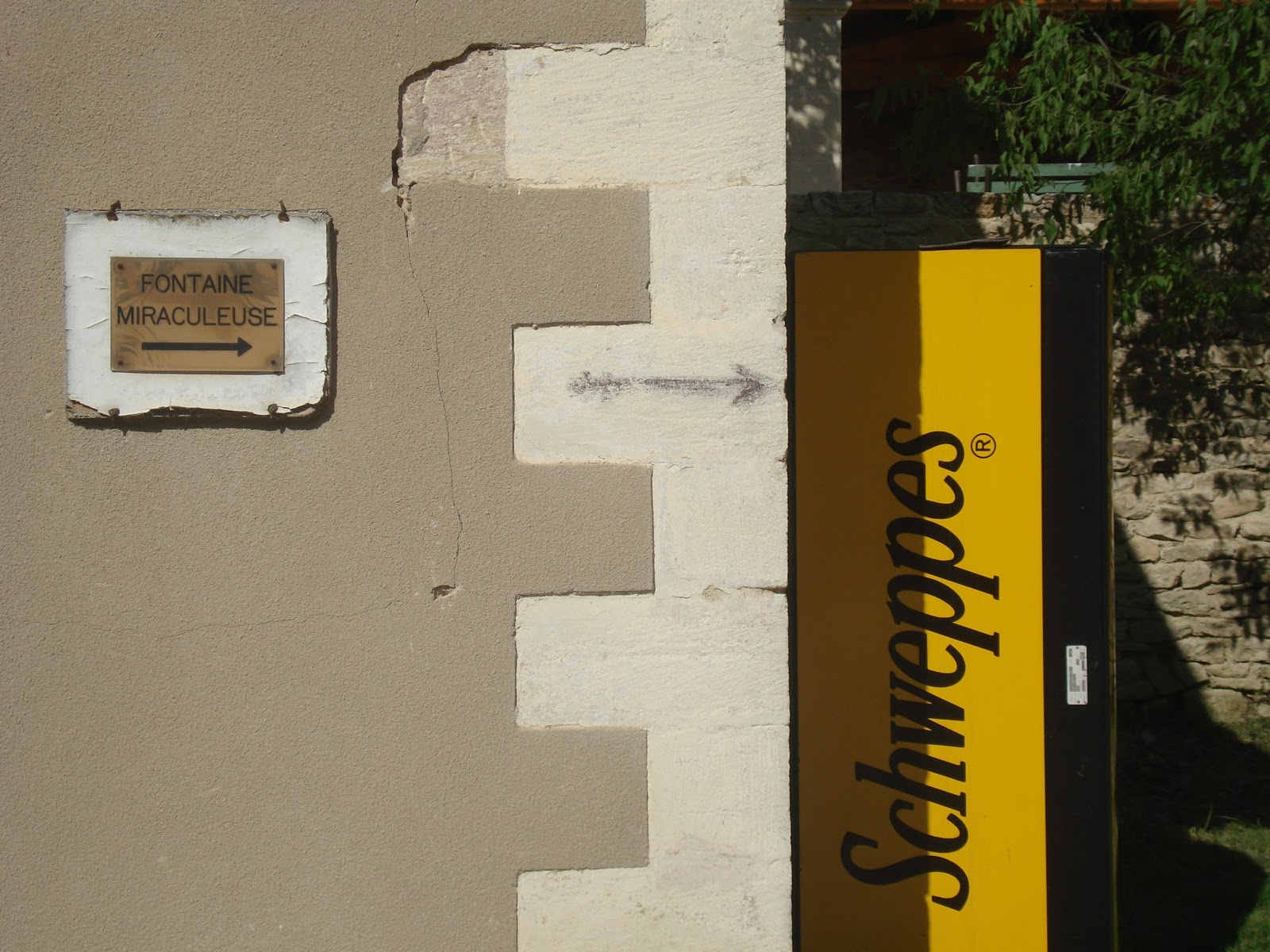 Hasard heureux que cette proximité, comme celle de ce distributeur, dans l’axe d’un lieu de pèlerinage, qui sème le doute… Peut on réellement être baptisé au Schweppes?