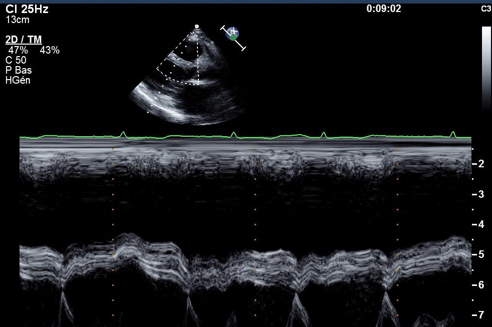 Sur cet exemple d’un patient présentant une PCC post tuberculeuse, l’aspect vibratile du septum en mode TM est très assez caractéristique :