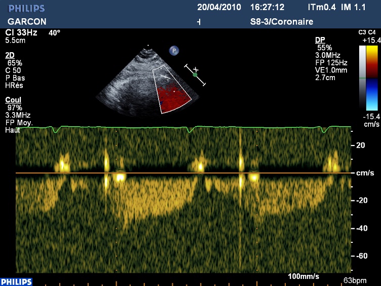 Très belle pente diastolique, même à l’envers, hélas trop rarement aperçue. On obtient, chez les pontées, des résultats similaires en effectuant le Doppler de la mammaire pontée.