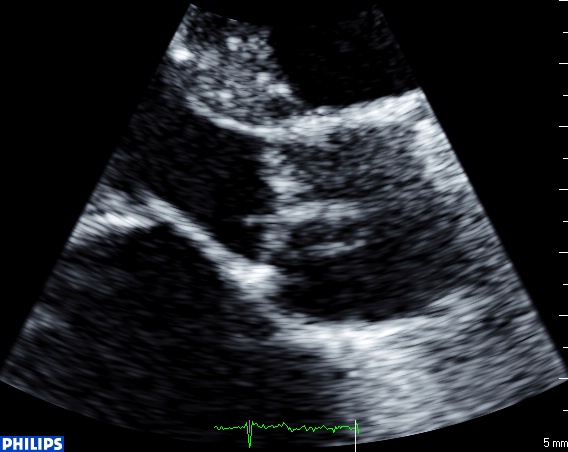 La premières sur la valve aortique : plusieurs éléments filamenteux, fins, mobiles, sur le versant ventriculaire et sur le versant aortique, sans le moindre contexte infectieux, et sans dysfonction de la valve.