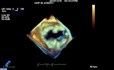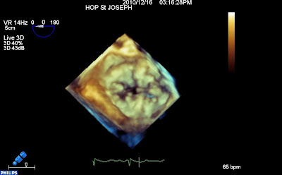 Si on se résume, l’implémentation du 3D sur cette valvulopathie mitrale permet de préciser la calcification annulaire, sa topographie exacte, avec une bonne concordance avec la ventriculographie. Cette information est cruciale pour le chirurgien (et pour la patiente!). Elle permet également de confirmer la topographie du prolaspus, (même si le diagnostic en ETO 2D est relativement univoque).