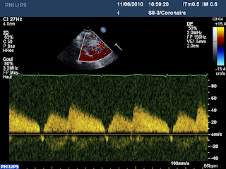 En Doppler, dans le pontage, un joli flux à prédominance diastolique :