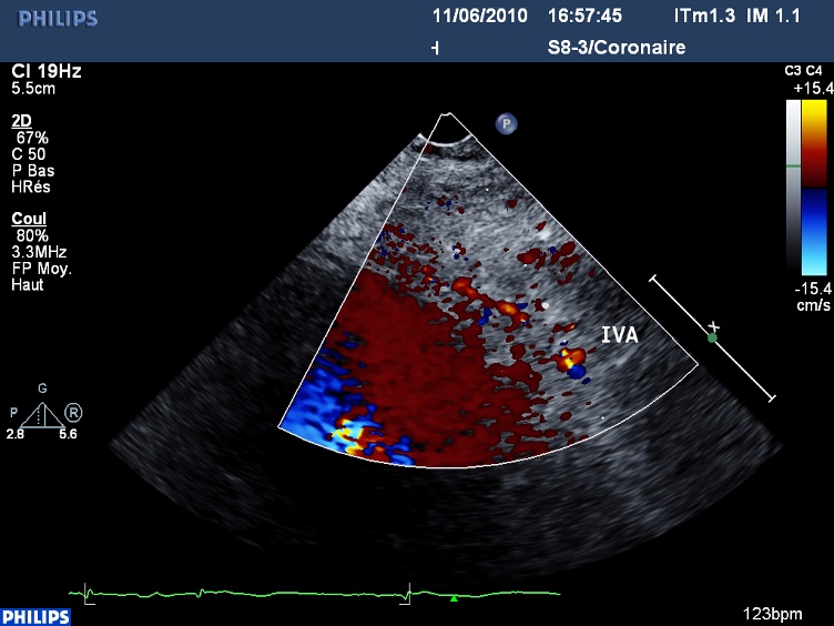 L’artère inter-ventriculaire antérieure (IVA) est bien visible dans sa portion apicale :