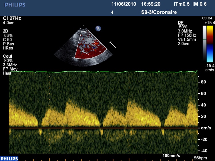 En Doppler, dans le pontage, un joli flux à prédominance diastolique :