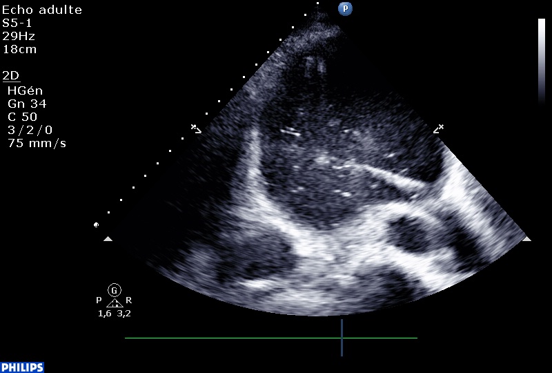 Même si il est difficile de sortir un échographiste de son rôle de contemplateur, c’est possible. Après avoir injecté quelques bulles pour s’assurer d’être dans le péricarde, on passe un guide métallique (pas trop loin le guide, Nico, stp…)