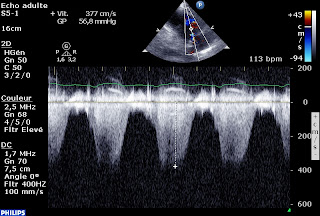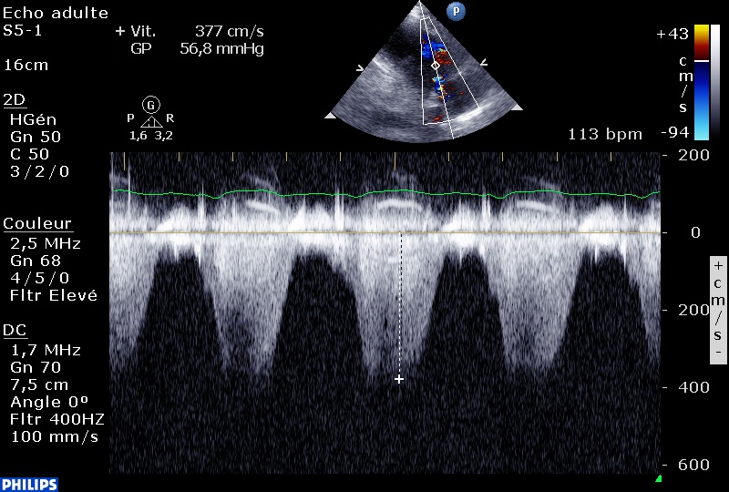 Une Vmax de le CIV à 3,6 m/sec, soit un gradient VG-VD à 55mmHg, donc une PAPs à 75 mmHg, si la pression artérielle systolique (qui est égale à la PVGs en l’absence de RAC) est à 130 mmHg.